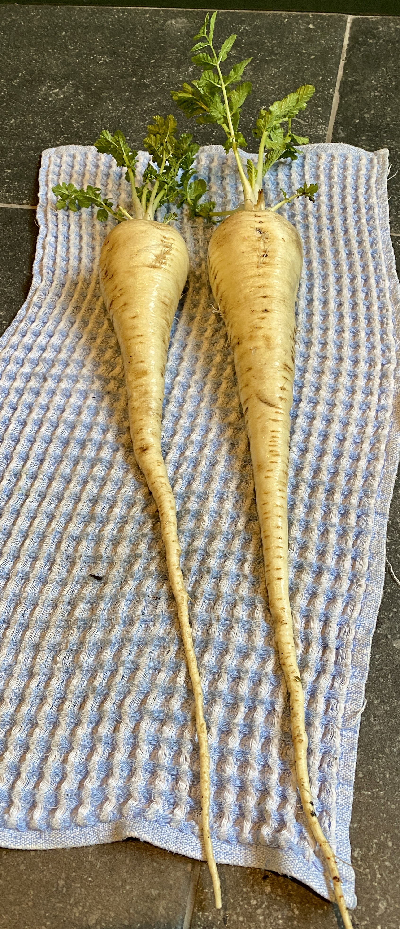 Unpromising tufts above ground revealed pale treasures below. Tender & True parsnips grown from direct sown seeds last spring and rather forgotten about since.