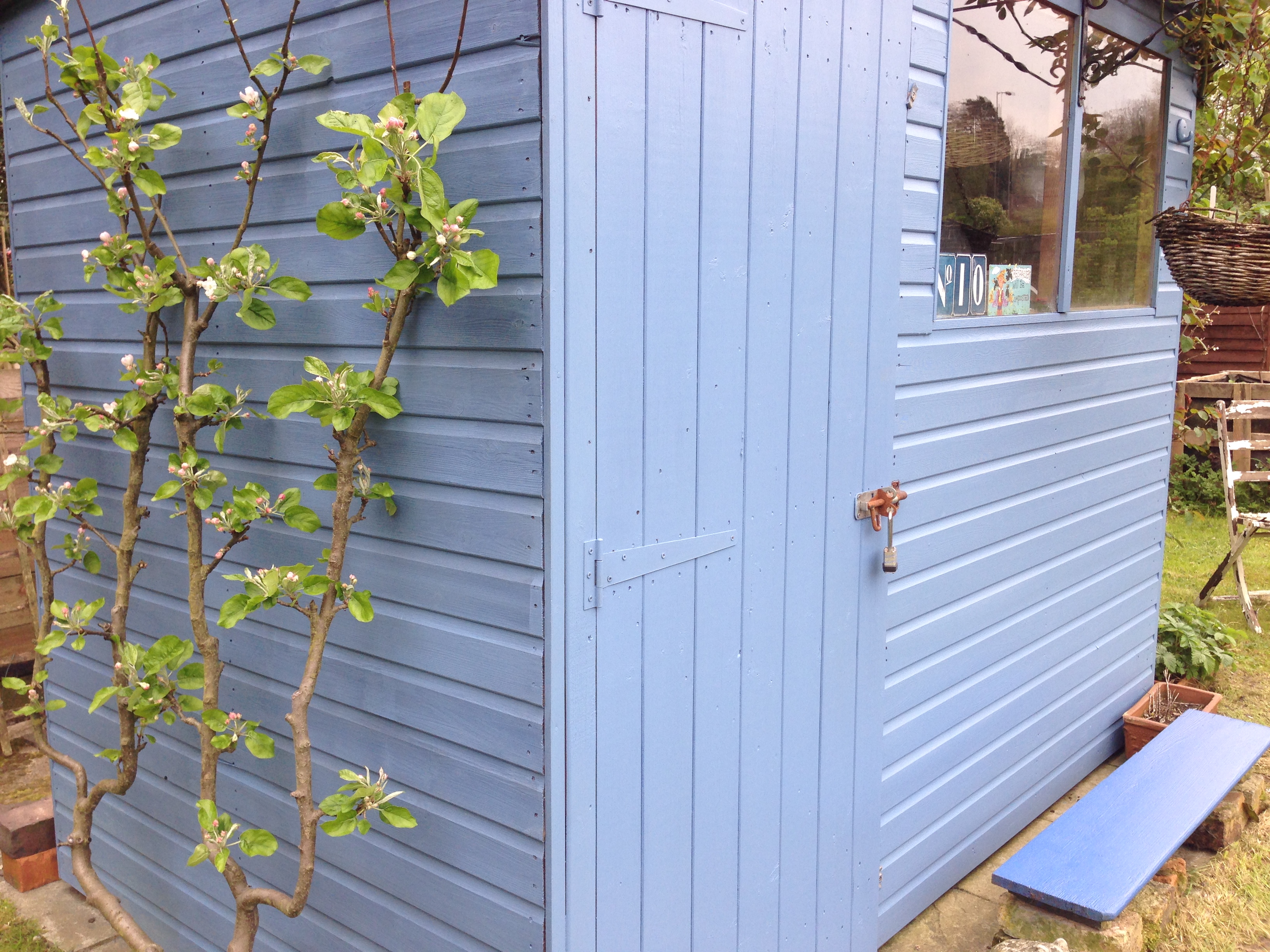 A new plot-holder adjacent to me not only erected an identical shed to mine, but then painted it the very same shade of deep blue (newly painted last year here). So as mine was looking dingy after the dark wet winter months, with green algae creeping in, I decided to repaint it today in another colour. So here it is freshly liveried in forget-me-not blue. It was rather tricky getting behind the espalier apple tree…