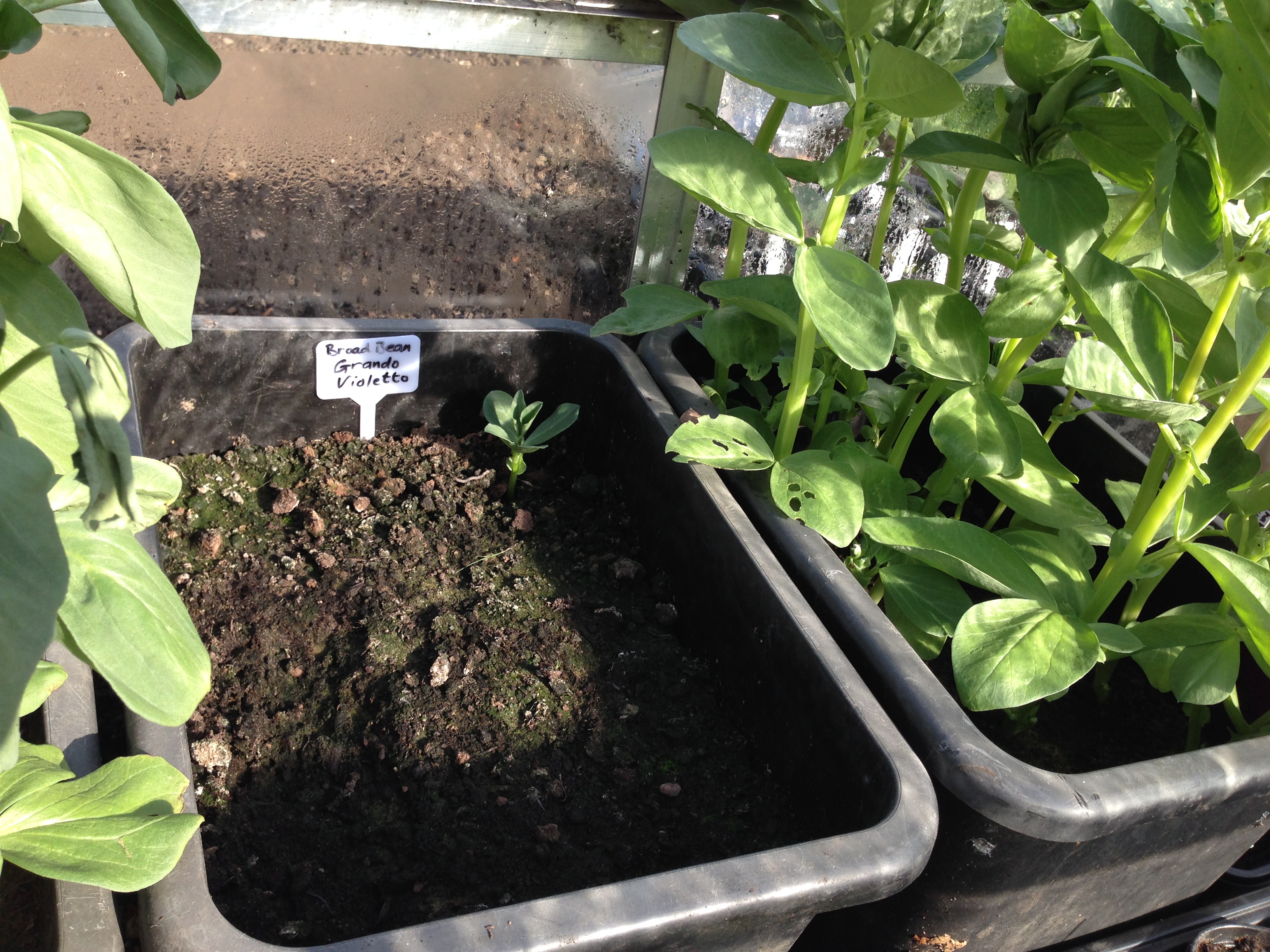 So three boxes of broad bean seeds were planted on the same day, and in the same way; heritage crimson flowered, witkiem manita and grando violetto (purple beans with a green pod). Then all placed in the cold frame to do their thing… Mysteriously, although the other two germinated and grew beautifully, the GVs did not! Just one runty little seedling has appeared. So far I’ve resisted poking about for signs of life…