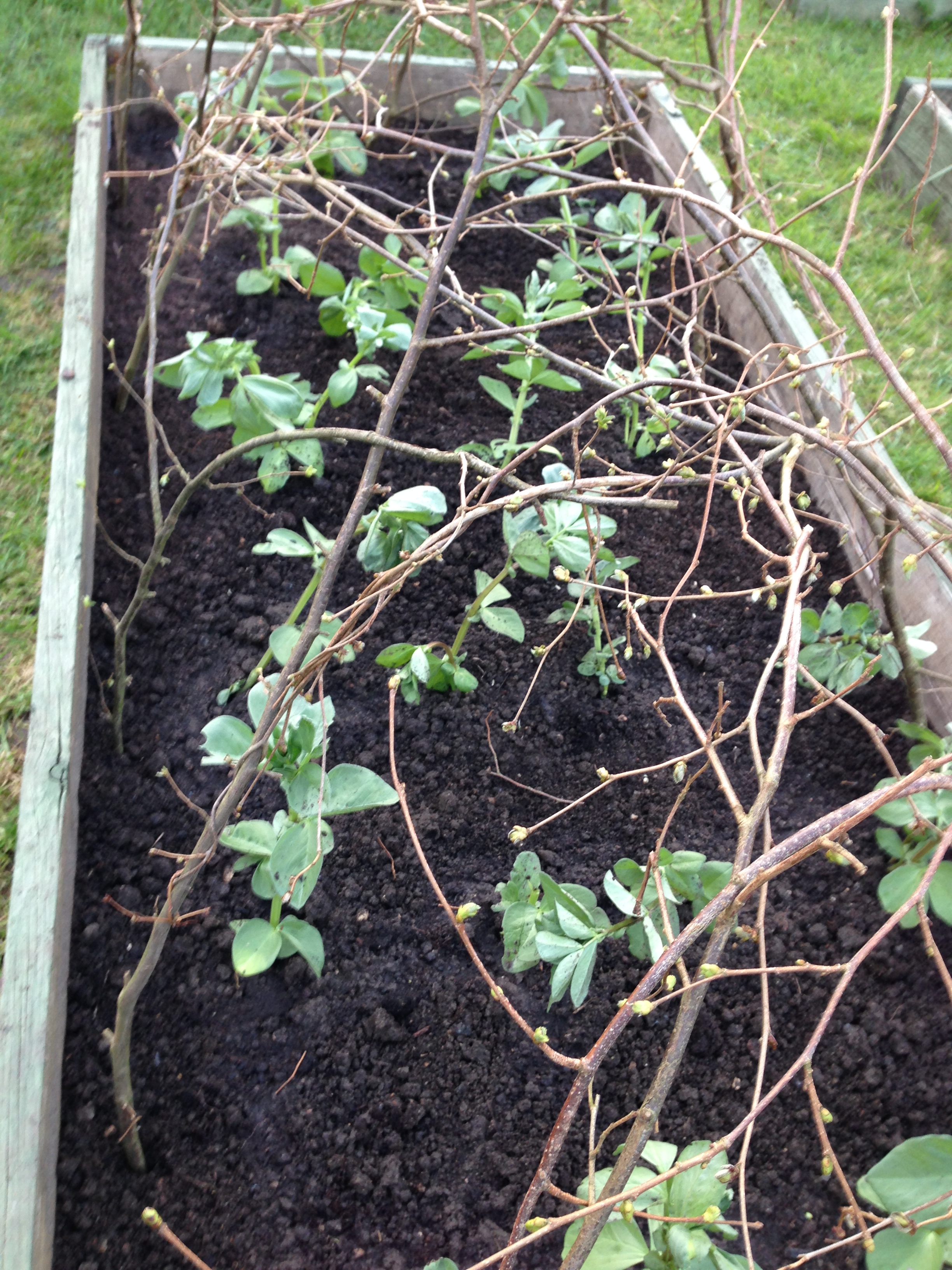 I’ve now planted out the broad beans that had germinated, along with the seedling peas ‘Champion of England’ bred in 1843 by William Fairbeard, a Kentish nurseryman – who was later consulted by Darwin when he was writing his book on natural selection. (I just love that sort of detail!) I learned about it on a very informative blog by Daughter of the Soil, to whom I am very grateful. I’ve had fun twisting locally coppiced hazel peasticks to create climbing support and, I hope, also protection from marauding pigeons.