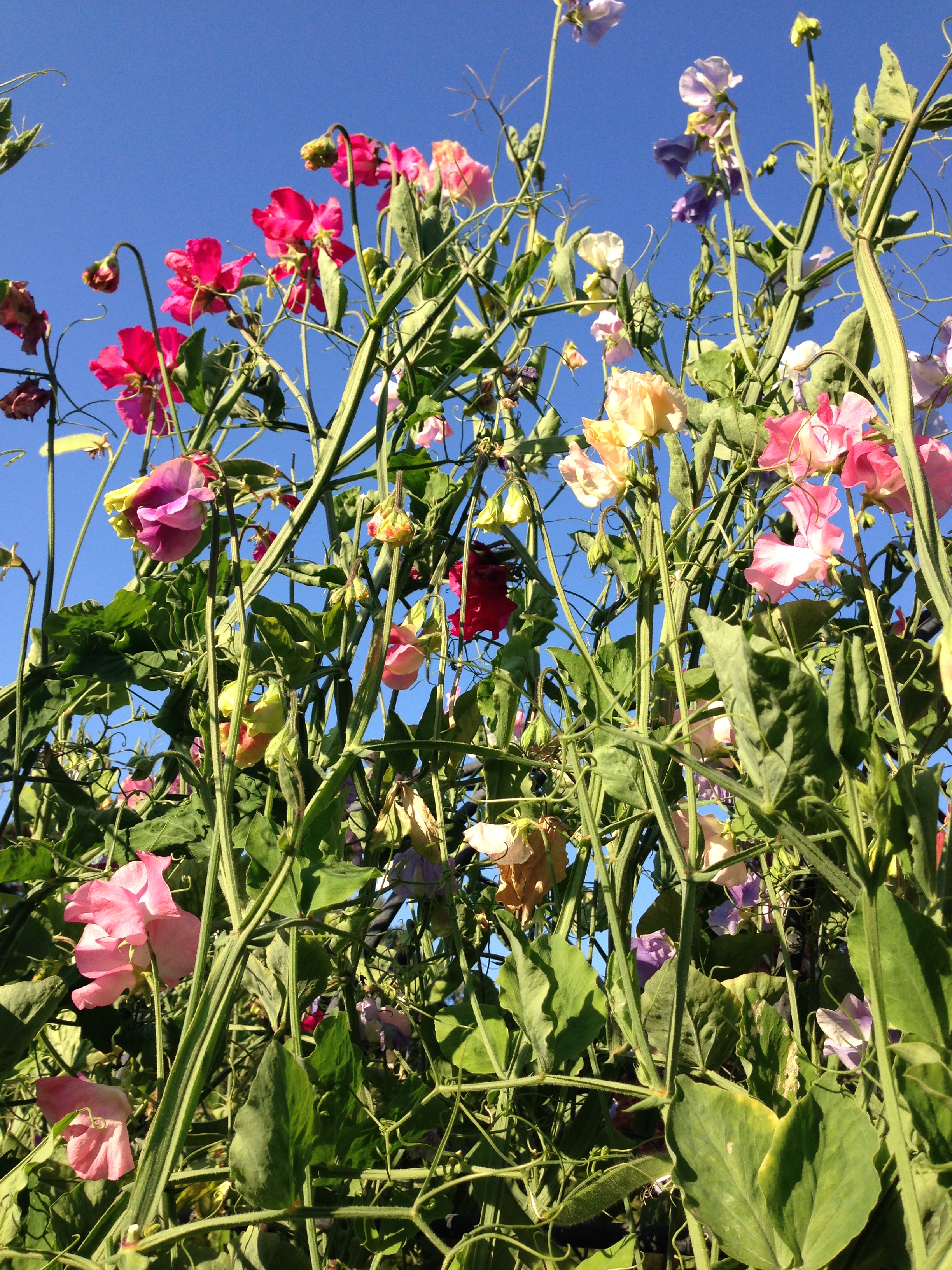 IMG_2941The sweet pea arch has now grown to such a height that I can barely reach the newest flowers. It’s hard to believe the fuss I had to get them going, just a few weeks ago. I think it was the ton of compost that eventually helped them take off. Courgettes too.