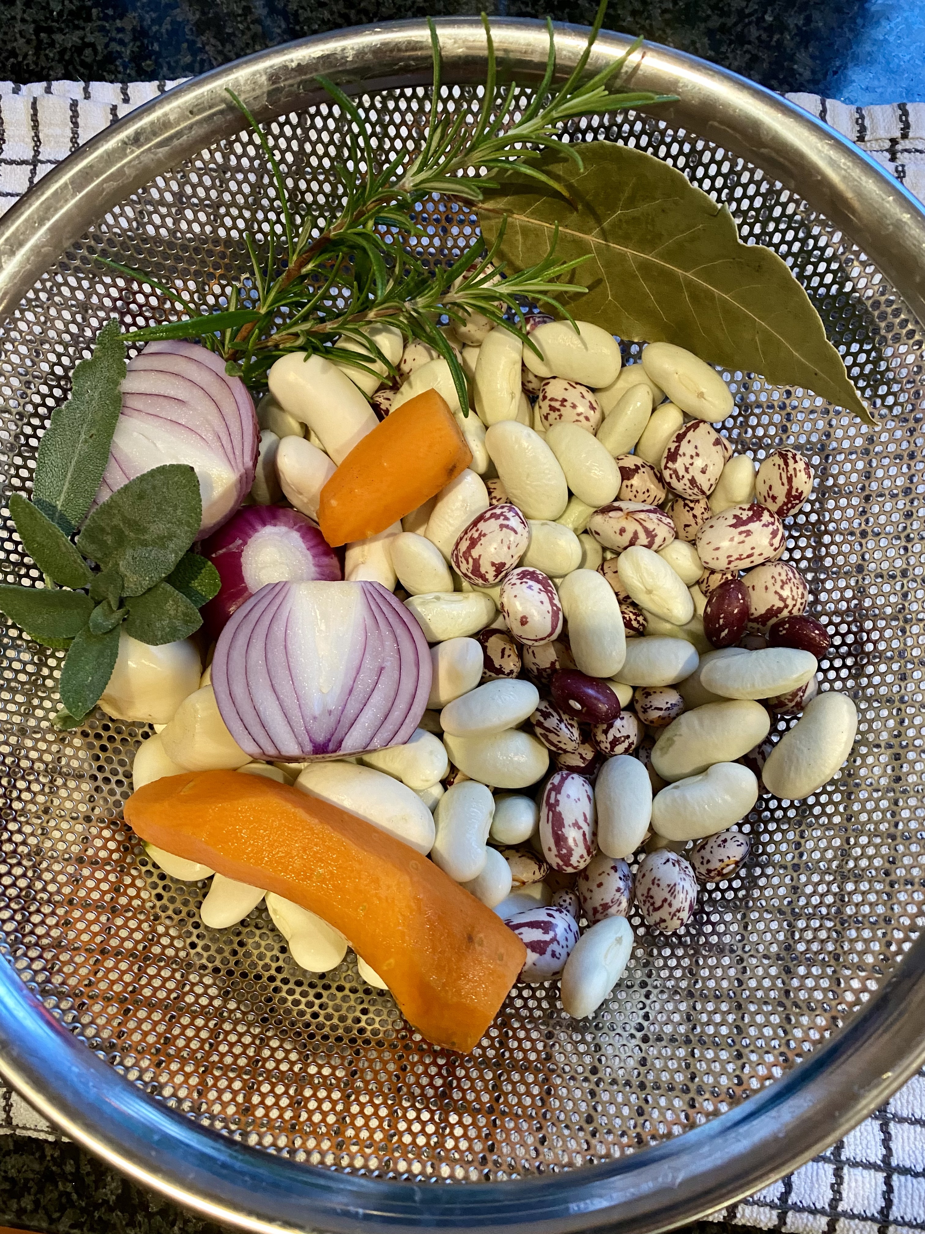 fresh Czar & Borlotti beans, with aromatics : carrots, onion, garlic, sage, bay and rosemary – all from the huerto