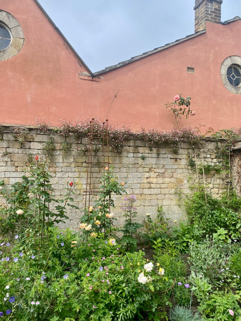 I have no idea how this rose came to implant itself high on the wall, with no apparent source of nutrition, but here it is. With no evident relation in the garden, it even managed to be the perfect colour to complement the wall behind it!