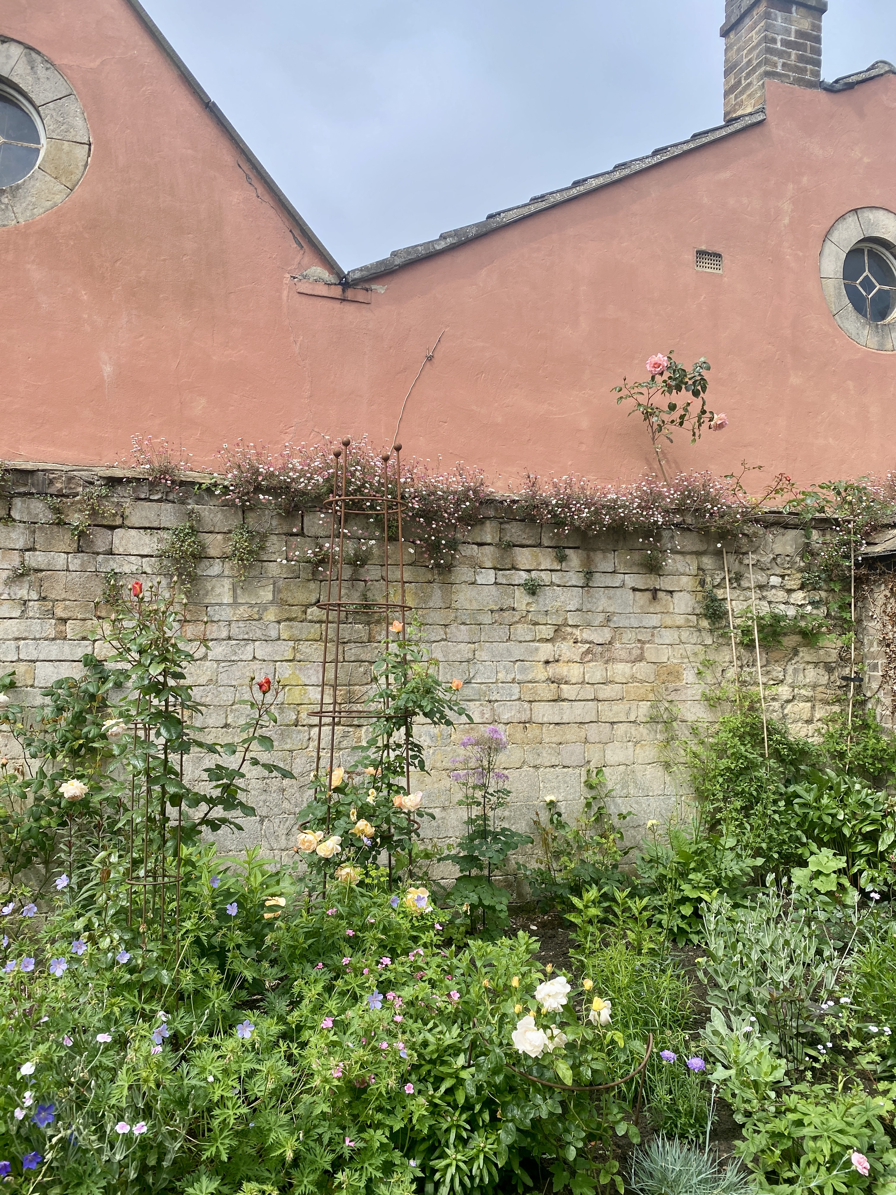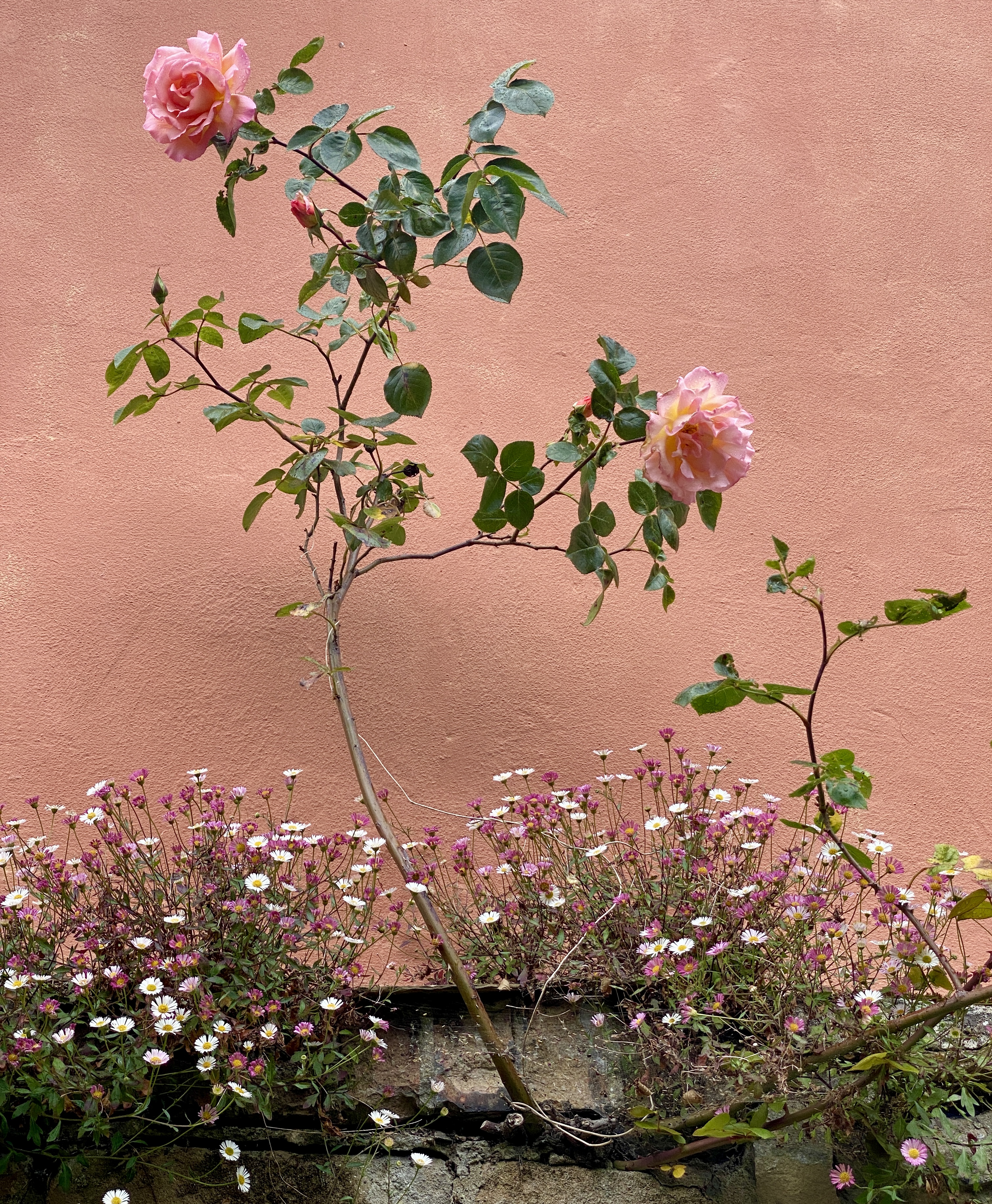 I have no idea how this rose came to implant itself high on the wall, with no apparent source of nutrition, but here it is. With no evident relation in the garden, it even managed to be the perfect colour to complement the wall behind it!