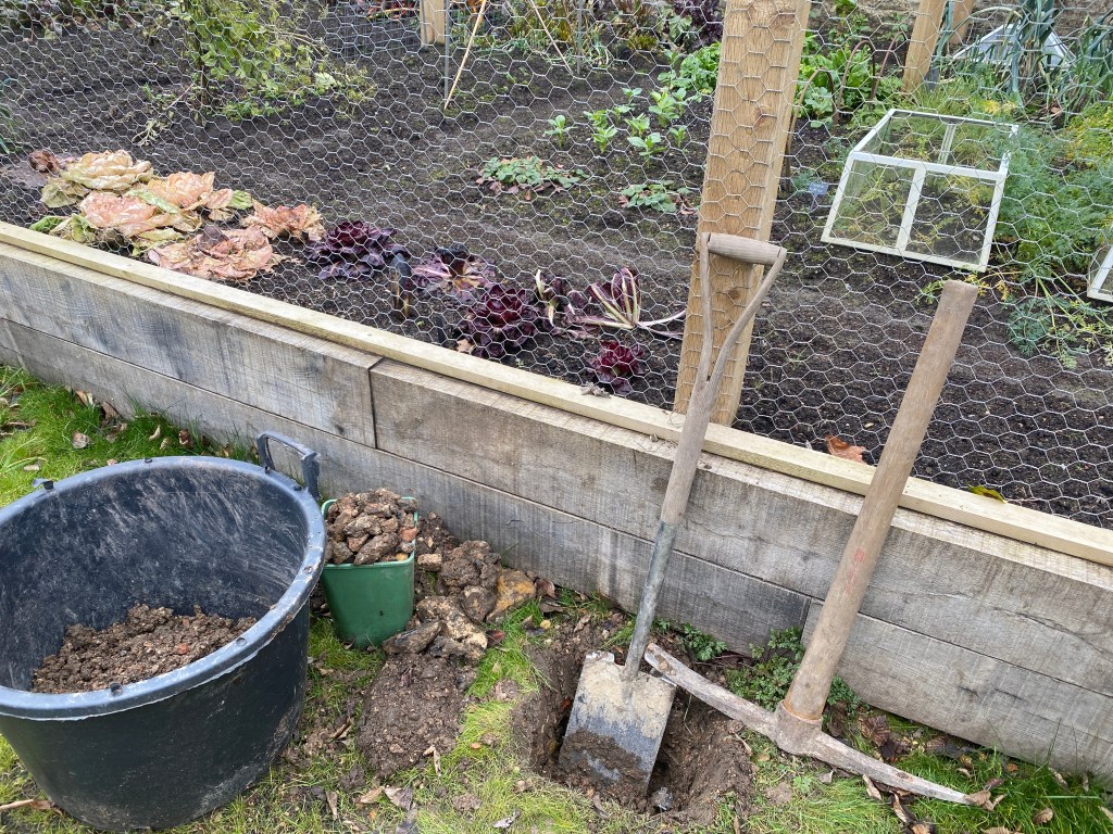 Pick axe, heavy spade and determination, daunting volume of excavated stones, bricks and builders’ junk, muddy knees and strained back – then a starter indulgence of micorrhizal fungi, Climate Compost, leaf mould and manure to aid the roots before they have to find a way through the harsh terroir beyond.