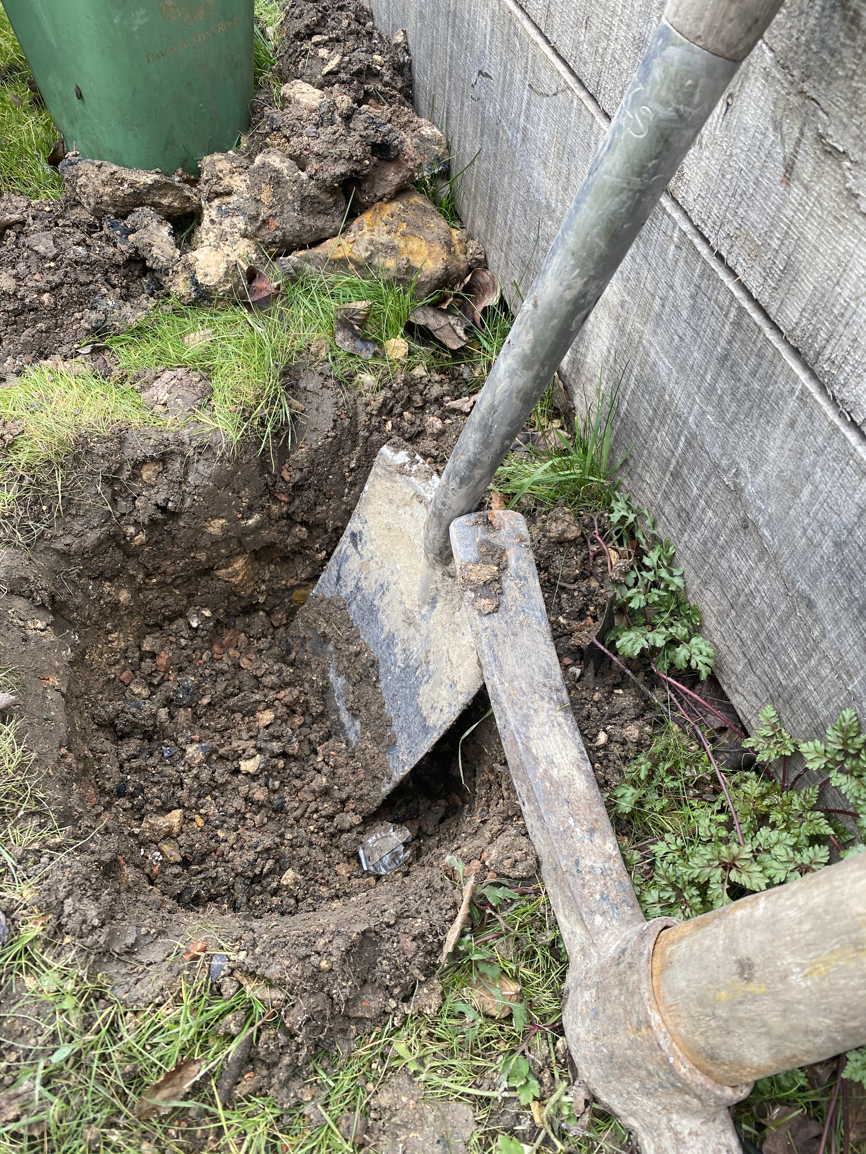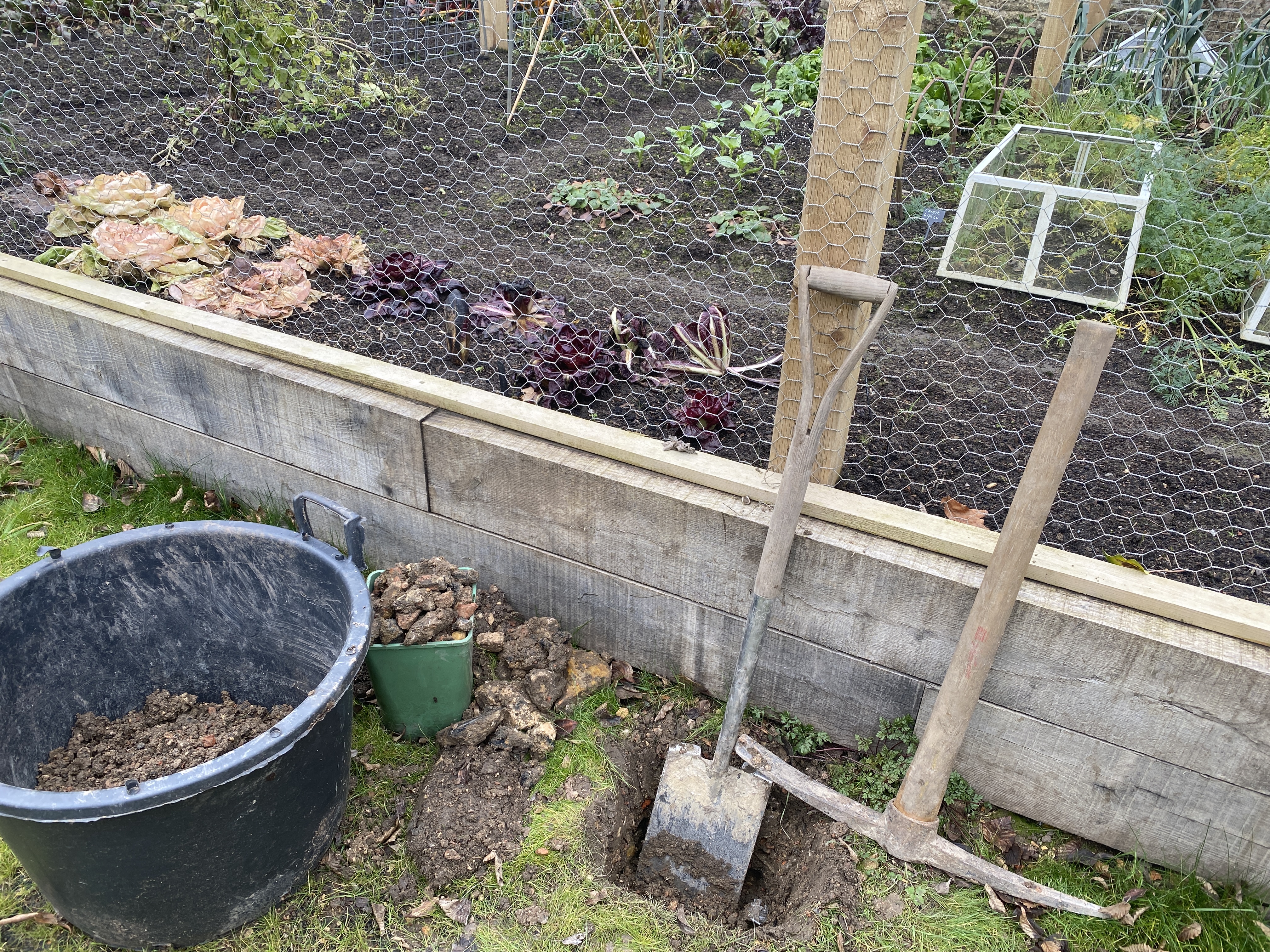 Pick axe, heavy spade and determination, daunting volume of excavated stones, bricks and builders’ junk, muddy knees and strained back – then a starter indulgence of micorrhizal fungi, Climate Compost, leaf mould and manure to aid the roots before they have to find a way through the harsh terroir beyond.