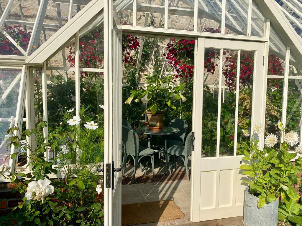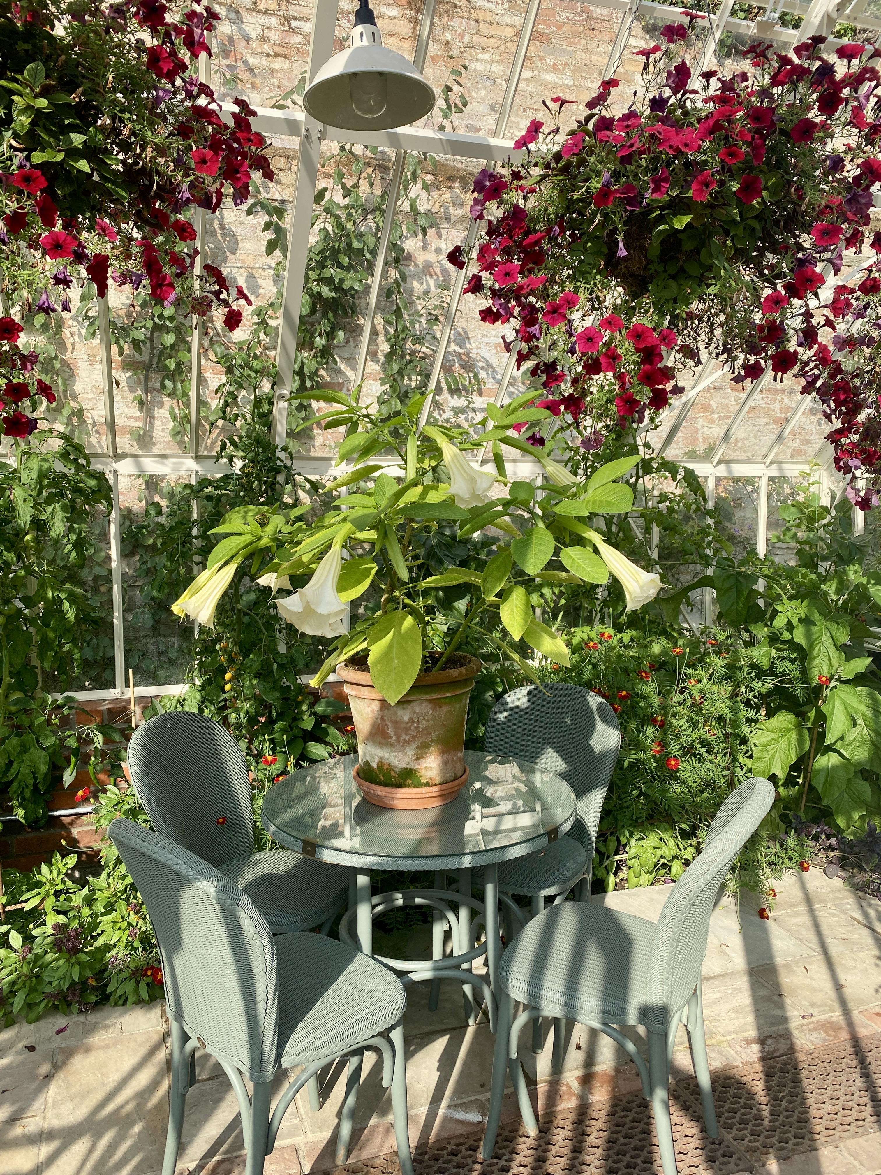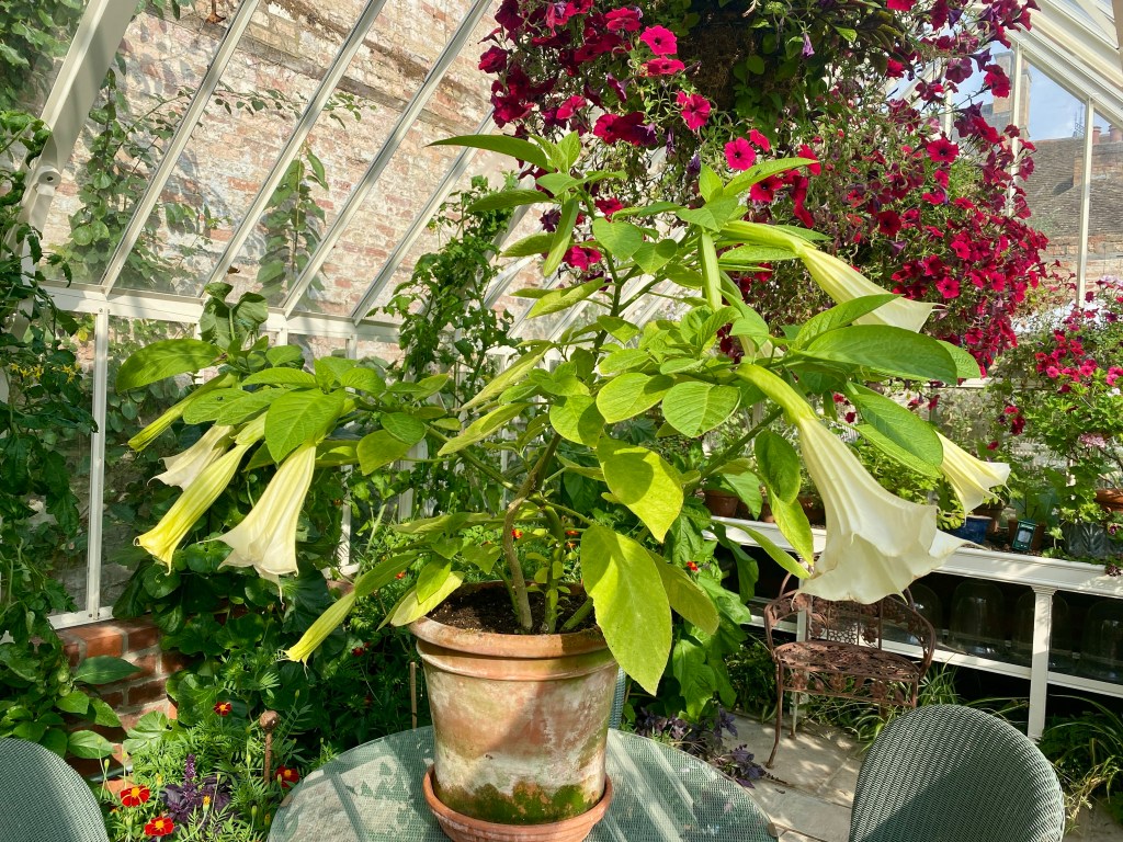 Ever since falling in love with one in the entrance to the large glasshouse at RHS Wisley, I wanted to grow a brugmansia. When I finally achieved my dream of having a “proper” glasshouse myself, a seller on ebay provided a small plant that I nurtured carefully over many months … with only a poor little stick to show for it. Fortunately, it finally dawned on me that perhaps the etiolated disappointment was due to nocturnal slug activity so I transplanted it to a nicer pot and positioned it more tactically. Success!