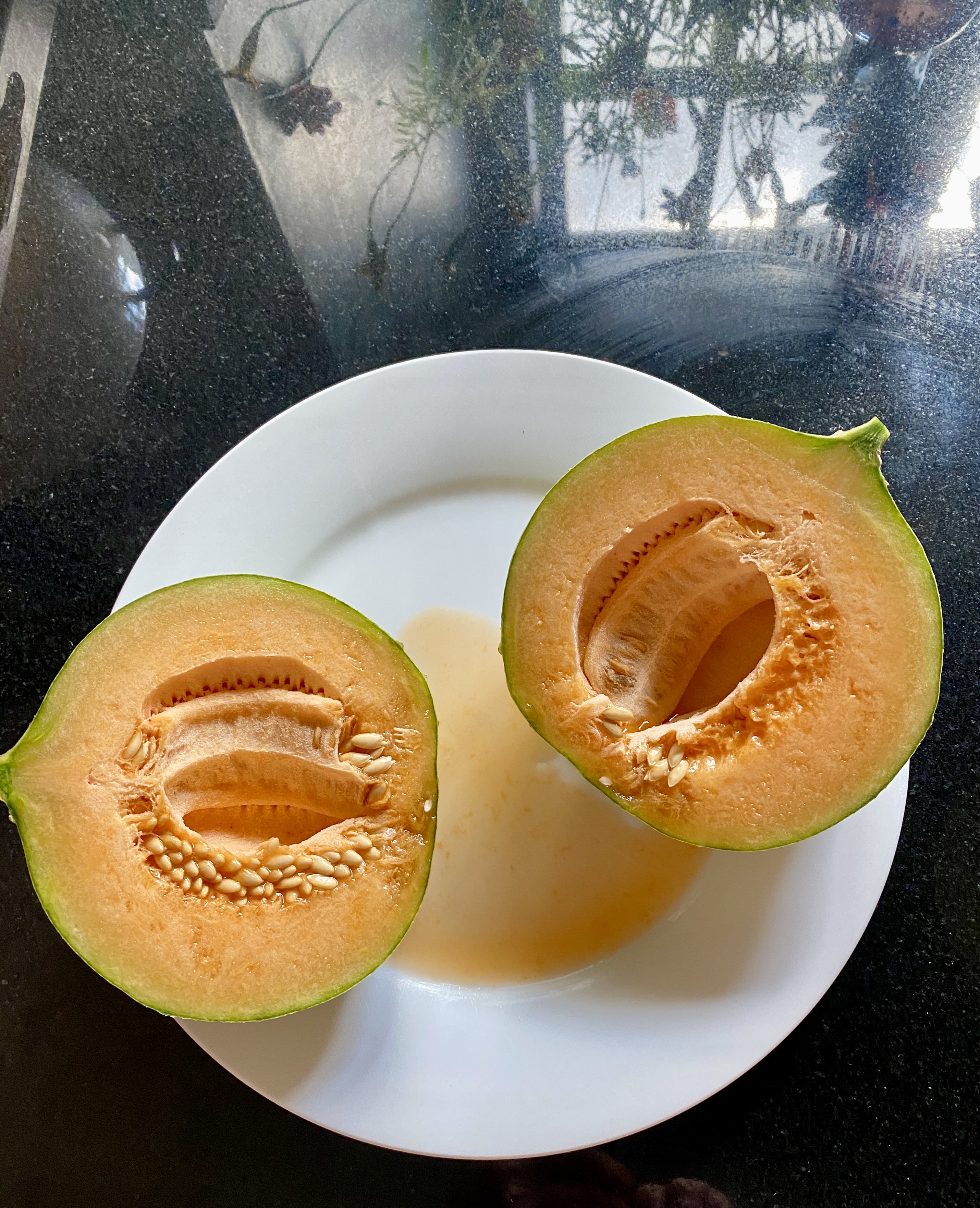 I had forgotten that I planted a tiny little melon seedling in the glasshouse… then mistook the rampant foliage for the adjacent cucumber… So it came as a great surprise to find a cluster of melons hidden amid the leaves. Beautifully scented and juicy.