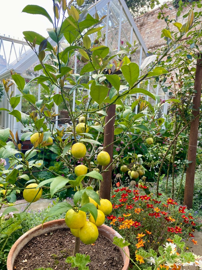 And the Meyer lemon tree has been happily enjoying a sunny corner all summer, fruits now nearly ripe.