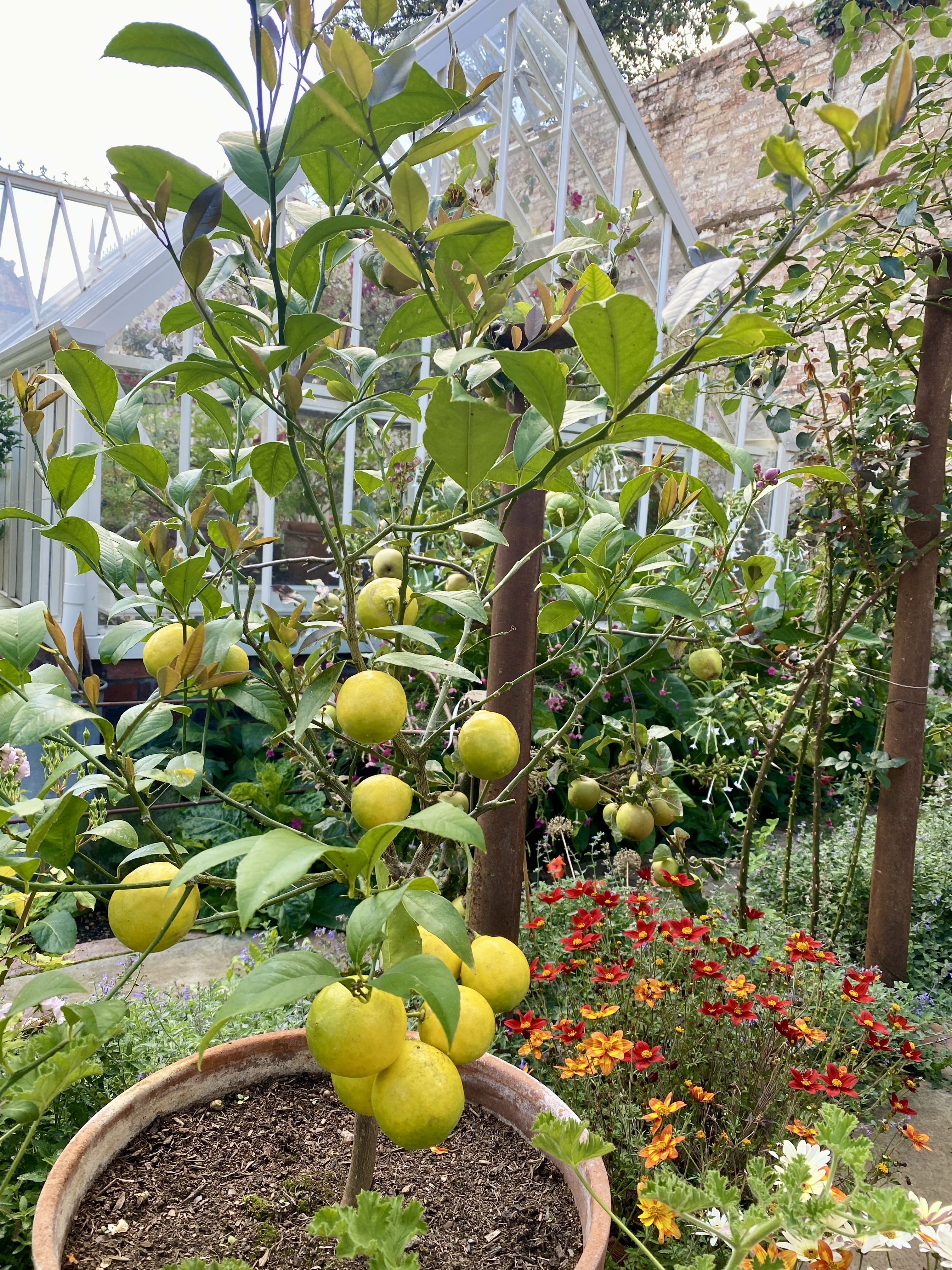 And the Meyer lemon tree has been happily enjoying a sunny corner all summer, fruits now nearly ripe.